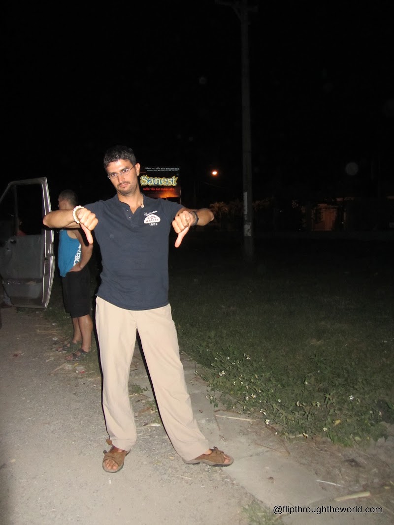 Si riparte, ma il peggio deve ancora venire: improvvisamente il minivan comincia a rantolare e si ferma “Broken”, ci dicono. Che attori! Il minivan che fino a 3 secondi prima andava che una bellezza, tutto sprint per i loro sorpassi folli in curva, ora è rotto?Siamo fermi in mezzo al nulla, su una strada in cui passano solo camion e bus, a pochi chilometri da nha trang. L’autista finge di vedere con una torcia all’interno del vano motore per una decina di minuti. poi lui ed il suo assistente si mettono ad i due lati della strada cercando di fermare gli autobus che passano. La loro speranza è quella di sbolognarci a qualche altro autobus di passaggio che va verso Saigon, un autobus si ferma, l’autista scende, si parlano e vengono verso di noi. L’autista dell’altro bus dice che possiamo continuare con lui, che ci sono parecchi posti liberi…Chiediamo al polacco di visionare l’autobus prima, lui torna e dice che c’è gente che dorme sul pavimento quindi non c’è spazio per noi…Mandiamo a cagare entrambi gli autisti.