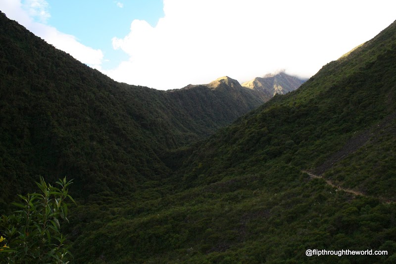 Scendendo il respiro inizia a ritornare più regolare, l’affanno e la neve diminuiscono fino a sparire. Cammino in una immensa vallata, il bianco inizia a lasciare il posto al rosso delle formazioni rocciose contenenti ferro, al verde ed al giallo del muschio che cresce a queste altitudini, compaiono nuovamente i ruscelli di acqua gelida. Rallento un pò il passo, facendo passare il gruppo avanti. Silenzio intorno a me, sembra non esserci alcuna forma di vita ma, osservando attentamente, lontano dal chiasso del gruppo, scorgo piccoli animali nuoversi tra il muschio e gli arbusti, sono i Cuy, o guinea pigs o porcellini d’india, che da queste parti mangiano in gran quantità durante le festività. Piccoli uccelli si muovono furtivi tra le rocce. Mano a mano che scendo di quota la vegetazione aumenta, insieme alle forme divita, la temperatura sale, devo togliermi degli indumenti per non morire asfissiato dal caldo, fino a che mi trovo in una foresta tropicale.