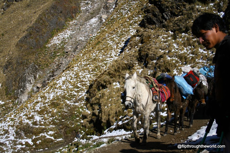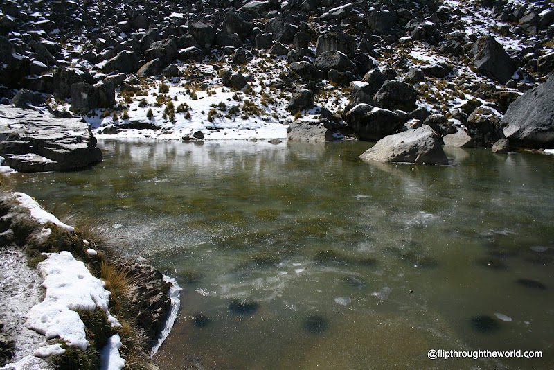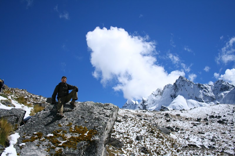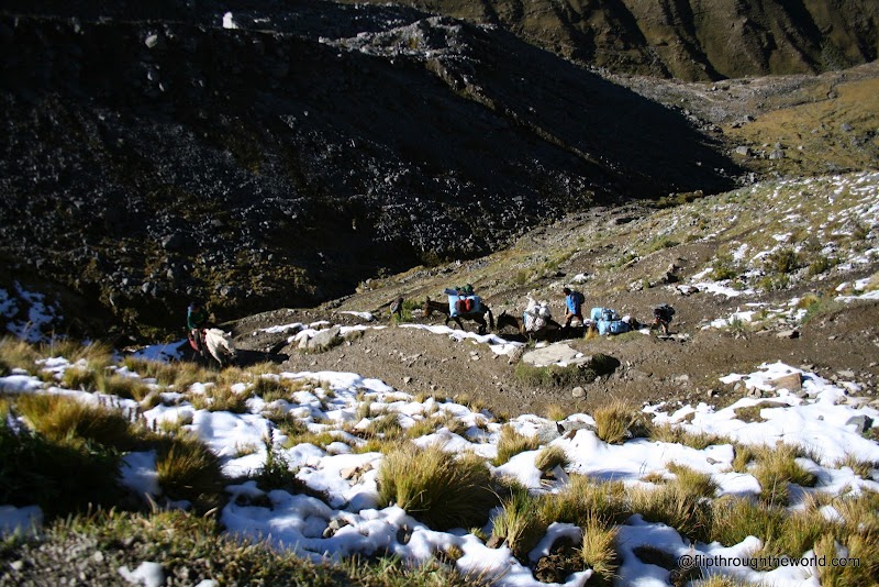 Questo sarà il giorno più duro di tutto il trekking ci avvisa la guida, arriveremo a toccare i 4.700m, i Km da fare sono parecchi, ci dice di tenere un passo calmo, senza esagerare, di fermarsi quando ci sentiamo affaticati. Capisco quello che voleva dire la guida quando iniziamo, poco prima dell’alba, la nostra salita verso le montagne innevate. Faccio due passi ed ho il fiatone, mi fermo per 5 minuti, il cuore batte all’impazzata come se avessi appena finito uno scatto da 200m, ne faccio altri 4, mi fermo nuovamente. E così molto lentamente, in una fila umana di zombie, saliamo verso il punto più alto. Tutti sono più fermi che in movimento, le condizioni sono veramente estreme e più saliamo e peggio diventa. Nel frattempo il ghiaccio e la neve iniziano a comparire ai lati, in timide chiazze, in un crescendo di bianco che mi porterà a camminare in una vallata innevata.