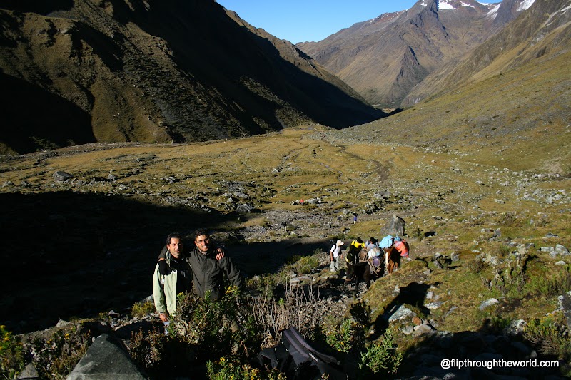 Siamo circa 10 persone nel gruppo, ci sono due guide, un cuoco, un aiuto cuoco e due portatori, più un numero imprecisato di muli per portare tutta l’attrezzatura. La prima giornata scorre liscia, la temperatura è piacevole, siamo a circa 2.300 metri sul livello del mare, meno che a Cusco (2.900m) si riesce quindi a camminare e respirare abbastanza tranquillamente (è oramai circa un mese che sono a queste altitudini, sono quindi un pò abituato alla minore presenza di ossigeno nell’aria). Saliamo per tutti i 24 km, lentamente, fino a raggiungere il campo base a circa 3.400m, dove passeremo la notte. Mano a mano che saliamo la piacevole vegetazione lascia il posto a bassi cespugli così come il verde lascia il posto al giallo. Piccoli ruscelli di acqua fredda come il ghiaccio scorrono tutto intorno a noi, costeggiamo montagne immense fino a giungere ad una vallata al calar del sole. Il freddo inizia a stringere la sua morsa, tutto attorno a me picchi innevati che rendono la vallata un vero e proprio freezer naturale.