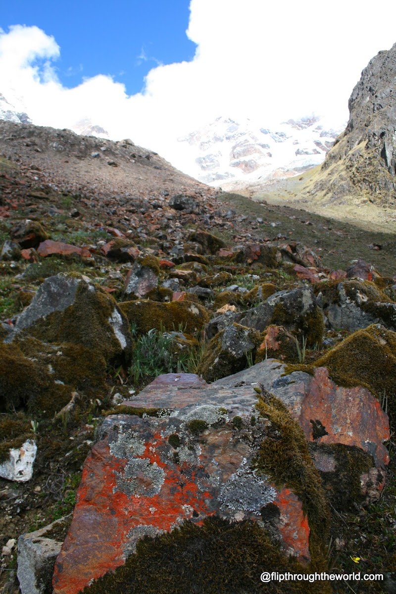 Eppure c’è gente che ci vive qua, poche casette fatte di fango, lontane kilometri le une dalle altre danno alloggio a circa dodici famiglie che vivono di allevamento (di Alpaca e Lama, strambi animali che sembrano incroci tra cammelli e pecore) e di agricoltura, quando la temperatura lo permette nei mesi estivi (coltivano delle particolare tipologie di cereali che crescono solo a queste altitudini). Il crepuscolo lascia il posto alla notte buia, senza luci, con un cielo stellato tra i più belli visti durante il viaggio. Solo le nostre torce e qualche candela illuminano il campo base. Dopo una frugale cena a base di riso, carne e verdure cotte e dopo una mezoretta passata a chicchierare con gli altri membri del gruppo il freddo mi spinge verso la tenda dove trovo ad aspettarmi Steven, Newyorkese di orgini Hispano-greco-israelita, che sarà il mio compagno per tutte le prossime notti. Persona singolare Steven, un pò strambo, a cui devo però un consiglio che ha reso la mia esperienza durante il trekking incredibilmente migliore: ” ogni tanto durante la camminata, mi piace rallentare e mollare il gruppo con cui sto camminando, per godere del silenzio della natura e potermi concentrare sulla flora e la fauna vedendo cose che altrimenti non potrei vedere.”